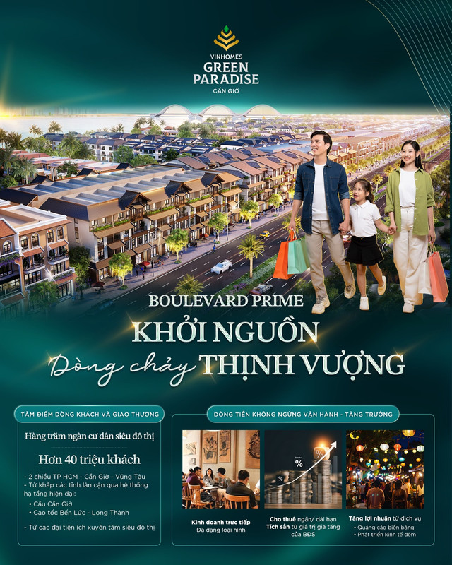 Không phải ngẫu nhiên Boulevard Prime được xem là dòng sản phẩm nổi bật về khả năng khai thác thương mại tại Vinhomes Green Paradise Cần Giờ. Giá trị của phân khu này đến từ ba yếu tố cốt lõi: lưu lượng người lớn, khả năng vận hành xuyên suốt quanh năm và dư địa tăng trưởng dài hạn. Thông tin tổng quan về dự án có thể tham khảo tại https://cangio-vinhomes.com.vn
